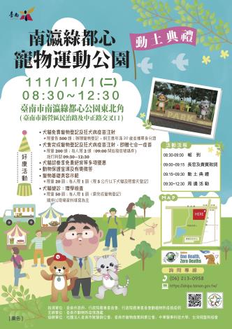 「南瀛綠都心寵物運動公園」動土典禮暨動保宣導活動活動時間:11/1(星期二)08:30-12:30 活動地址:臺南市新營區民治路36號(民治路及中正路交叉口)活動內容:動保處舉辦本市第二座寵物運動公園動土典禮暨動保宣導活動,現場提供限量寵物七合一疫苗、寵物健診、寵物美容,歡迎民眾帶寵物一同來參加!